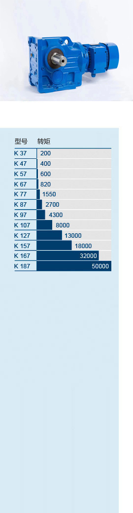 體積小,傳遞扭矩大 K系列斜齒輪-傘齒輪減速電機(jī)在模塊化基礎(chǔ)上設(shè)計制造,有極其多的電機(jī)組合、安裝形式和結(jié)構(gòu)方案,傳動比分級精細(xì),滿足不同的使用工況,實現(xiàn)機(jī)電一體化。 |